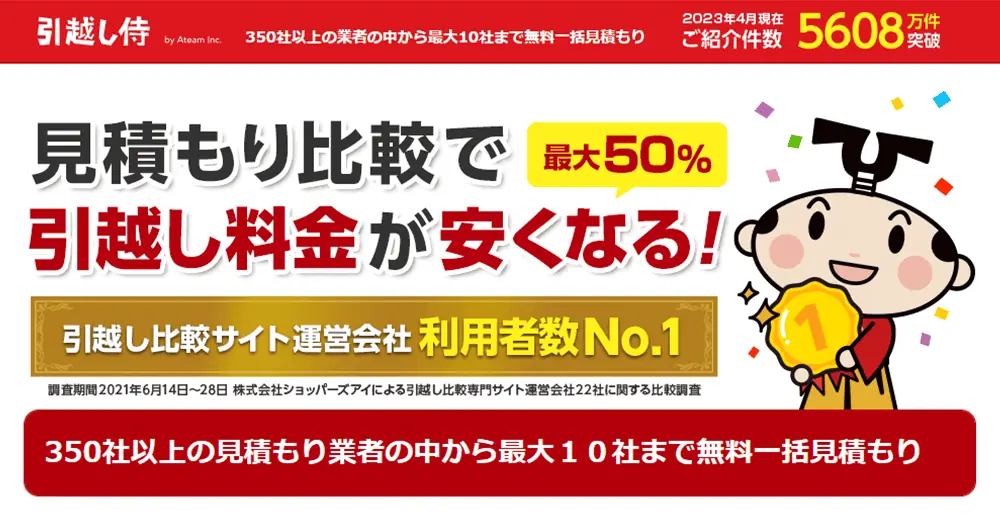 引越し侍は提携業者数が業界トップの353社に及び、大手から地元に根付いた中小の引越し業者を網羅しており、その豊富な選択肢からお得な引越し業者を見つけやすくなっております。さらに、業界NO.1ということでサイトも充実しており、見積もり依頼先の業者を自由に選べる上に、それぞれの業者についての口コミ情報も多く、より納得のいく選択が可能です。特にこだわりがなければ、引越し侍を使えば間違いないと思います。